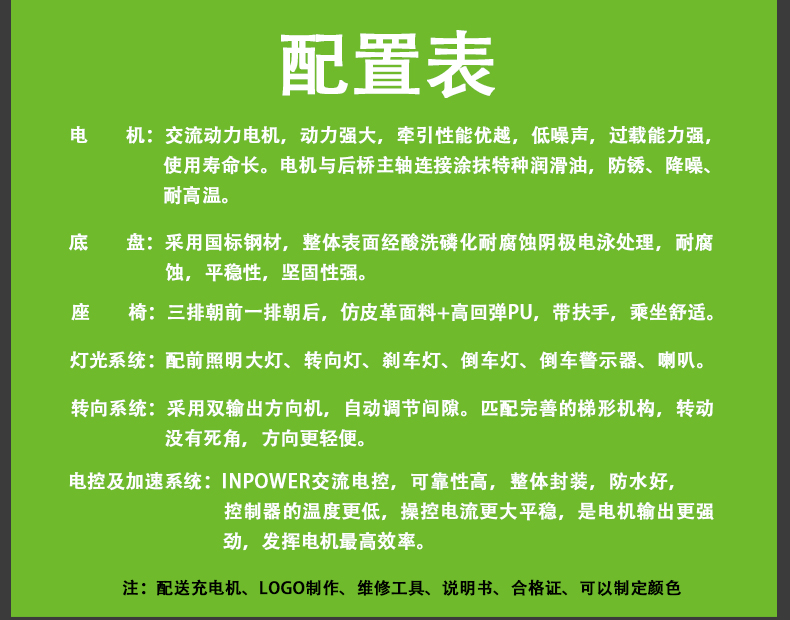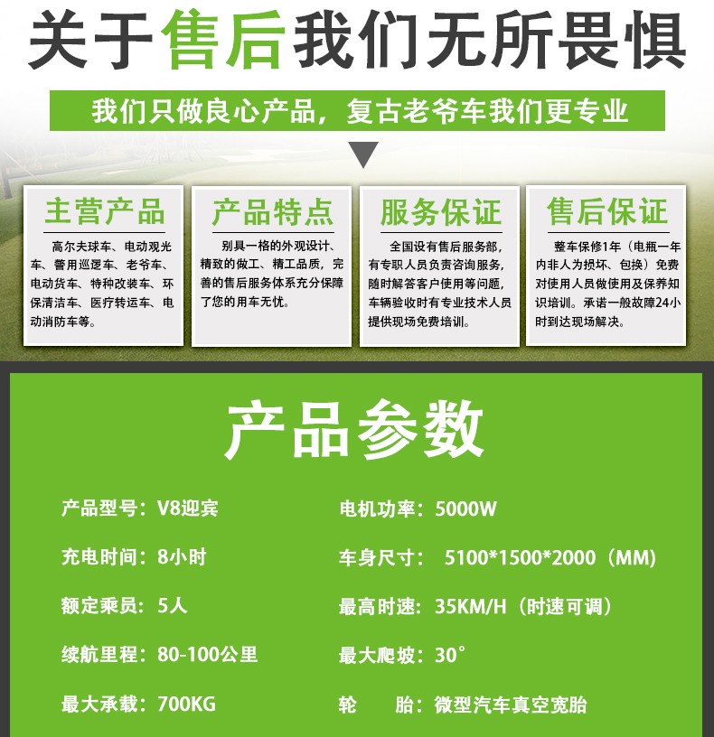 产品型号:V8 机电功率:5.0KW 外形尺寸(MM): 5100*1500*2000 最高时速(KM/H):30 整车重量(KG):870 最大爬坡度(%):25 最大承载(KG):700 充电时间(H):8-10 额定乘员:8 续驶里程(KM):80-100 是否可定制:是 其他: