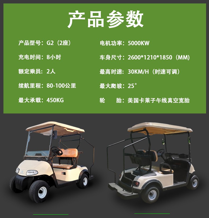 产品型号:G2 机电功率:3.8KW/5.0KW 外形尺寸(MM): 2600mm*1210mm*1850mm 最高时速(KM/H):30 整车重量(KG):435 最大爬坡度(%):30 最大承载(KG):450 充电时间(H):8-10 额定乘员:2 续驶里程(KM):80-100 是否可定制:是 其他: