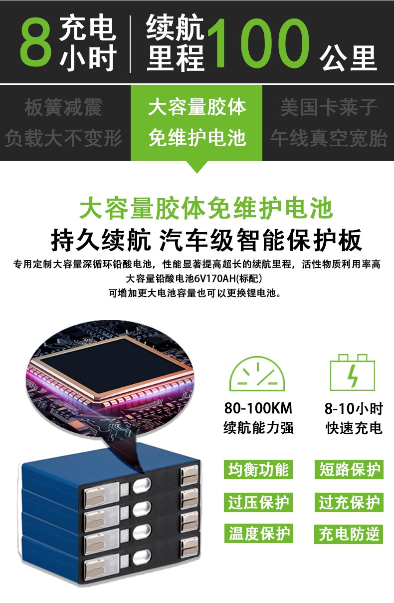 产品描述:该车底盘低,上下方便,转弯半径小,操纵灵活·并采用真空宽胎,复合式前悬架系统,减震性能优良,行驶平稳,驾乘舒适;后悬架采用钢板弹簧减震采用高回弹、高承载板簧设计,整车载重
