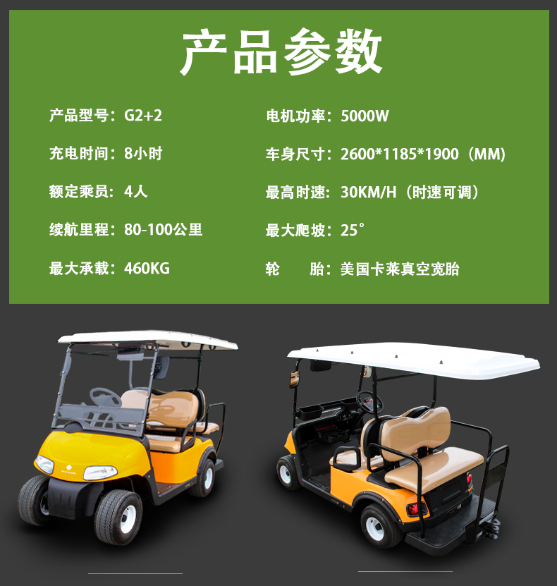 产品型号:G2+2 机电功率:3.8KW/5.0KW 外形尺寸(MM): 2600mm*1210mm*1850mm 最高时速(KM/H):30 整车重量(KG):435 最大爬坡度(%):30 最大承载(KG):450 充电时间(H):8-10 额定乘员:4 续驶里程(KM):80-100 是否可定制:是 其他: