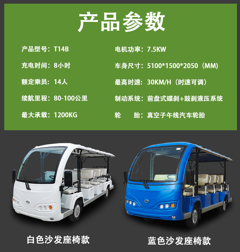 产品型号:T14B 机电功率:7.5kw 外形尺寸(MM): 5100*1500*2050 最高时速(KM/H):30 整车重量(KG):1120 最大爬坡度(%):30 最大承载(KG):1200 充电时间(H):8-10 额定乘员:14 续驶里程(KM):80-100 是否可定制:是 其他: