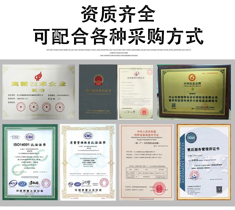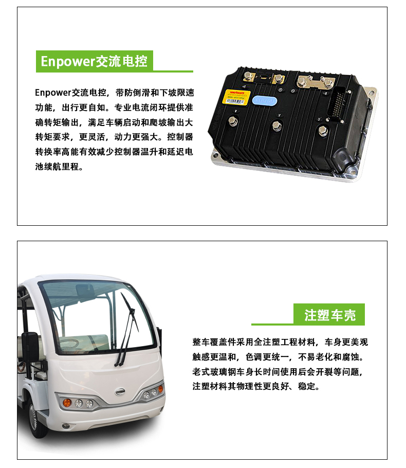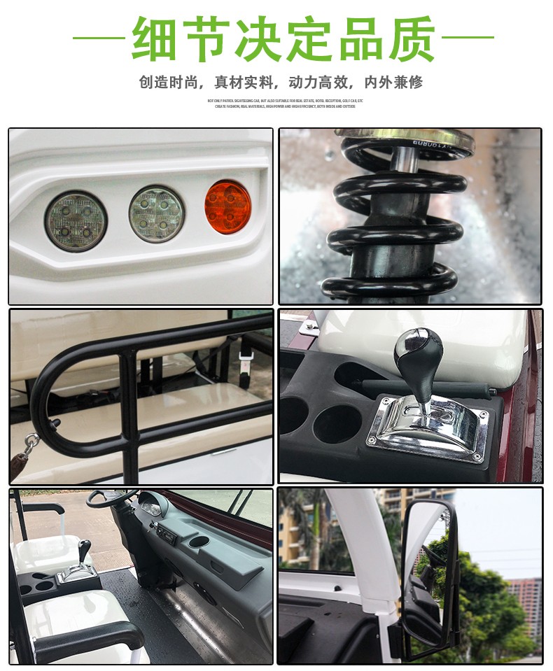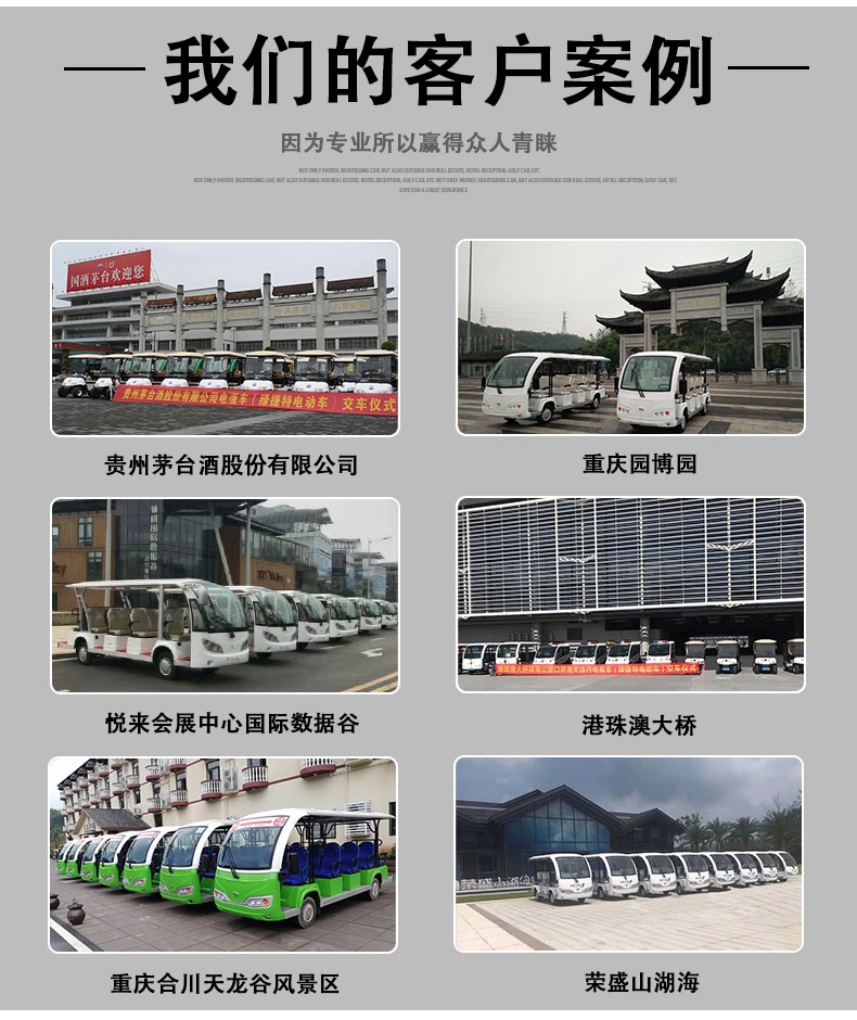 产品描述:豪华观光车定位于高端观光车市场,外观造型优雅简约,内饰设计豪华大气,将舒适的乘坐空间容纳于精巧车身。全新座椅工艺,防水防潮,坚实耐用;交流电器系统,动力更强劲,续航更持久;