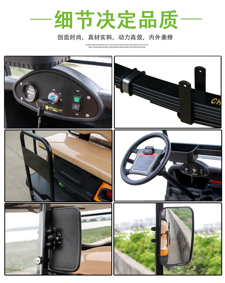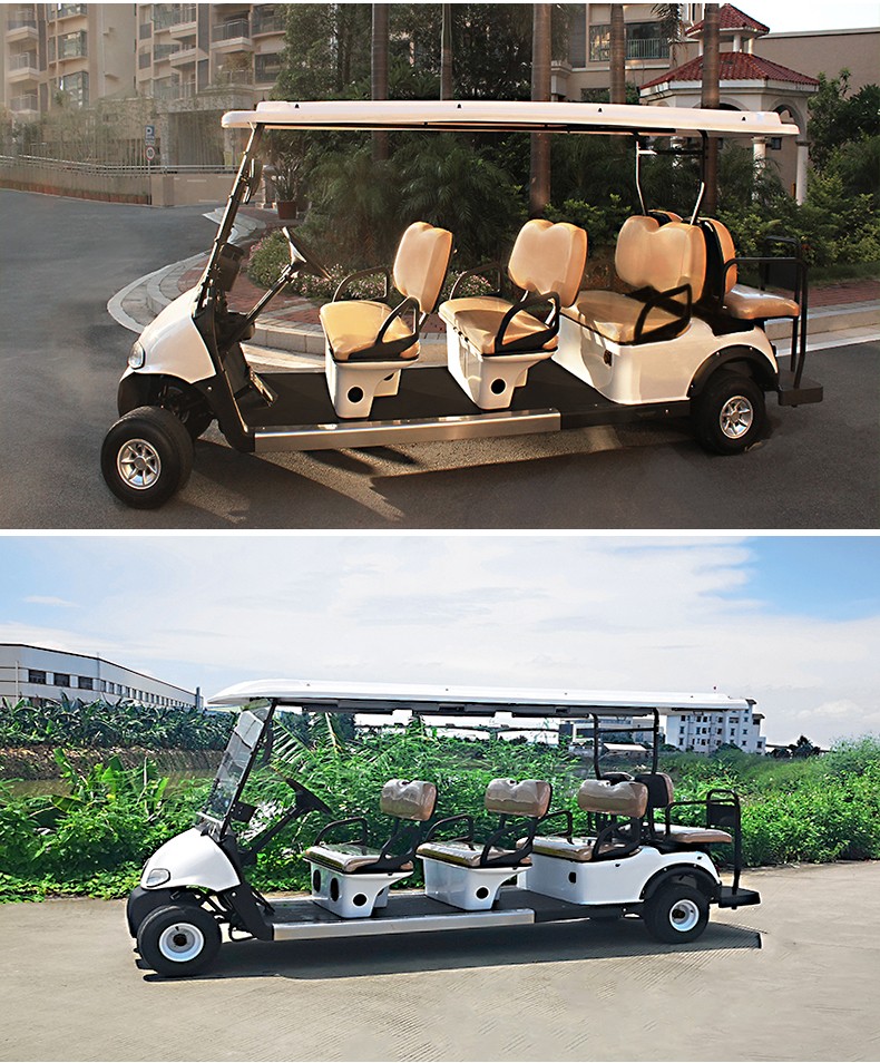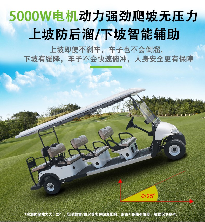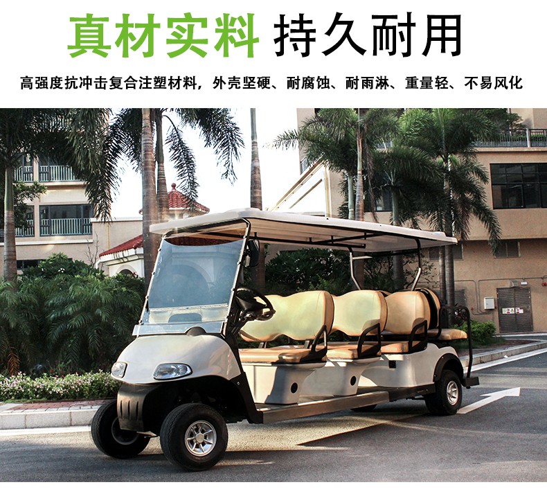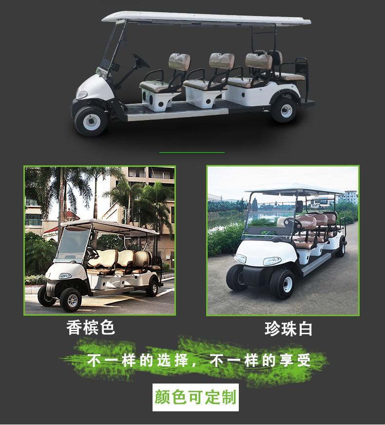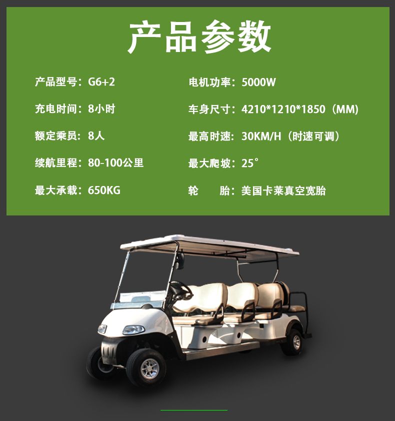 产品型号:G6+2 机电功率:5.0 外形尺寸(MM): 4210*1210*1960 最高时速(KM/H):30 整车重量(KG):640 最大爬坡度(%):25 最大承载(KG):650 充电时间(H): 额定乘员:6 续驶里程(KM):80-100 是否可定制:可以 其他:
